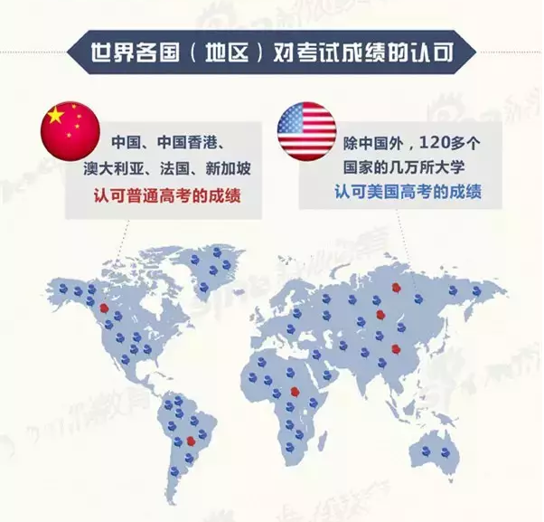 目前就中國的普通高考與美國高考相比,4個國家認(rèn)可普通高考成績,學(xué)生的認(rèn)可度稍顯弱并對之后的留學(xué)目的國選擇有所限制;相反,120多個國家的幾萬所大學(xué)認(rèn)可美國高考的成績,可見,擁有美國高考成績的學(xué)生猶如有一張國家“通行證”。
