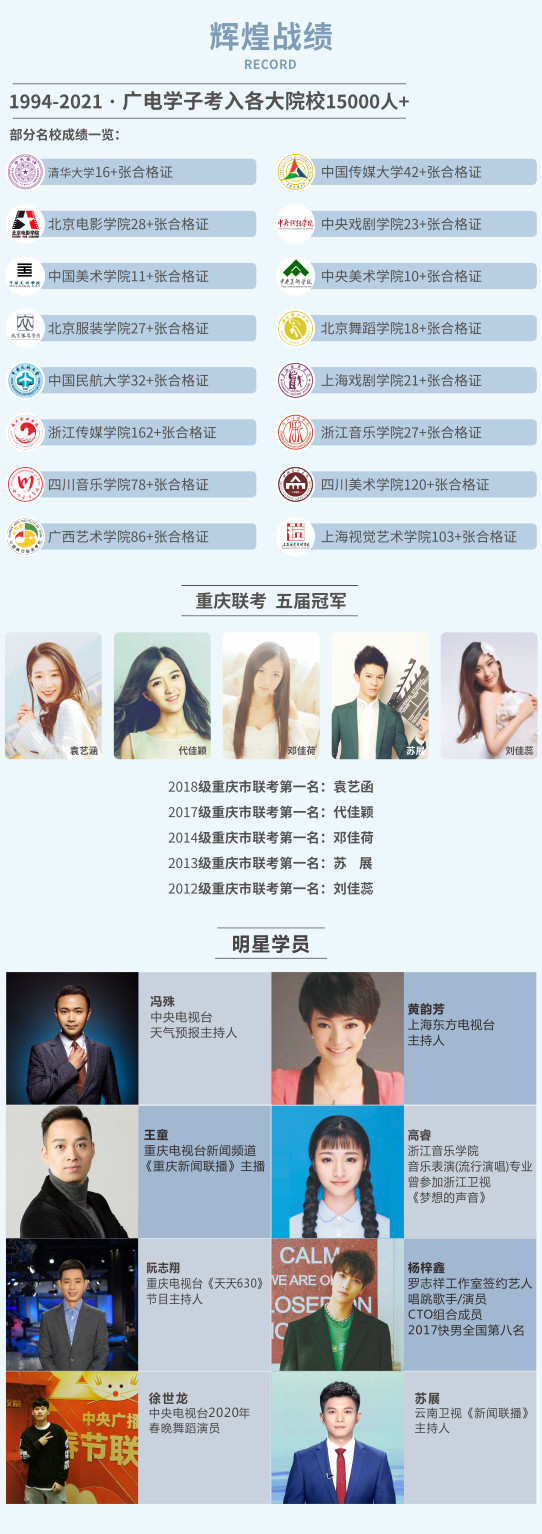 主要開展播音主持、表演、音樂、舞蹈、編導、攝影等高考培訓課程,行課期間在校內上課,寒暑假及高考集訓在重慶主城本部上課,80%以上的專業過關率。