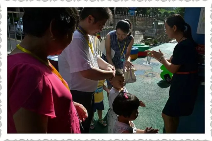 8點40分,我們的家長準時帶著寶寶入園簽到、消毒,同時我們發放參觀證,進行分組。