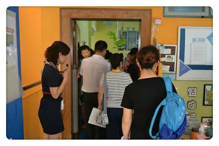 家長、幼兒分為三組,分別佩戴黃色、粉色、藍色參觀證,分別由楊助理、楊主任、彭主任帶領參觀幼兒園環境以及進班級觀察幼兒學習生活情況。