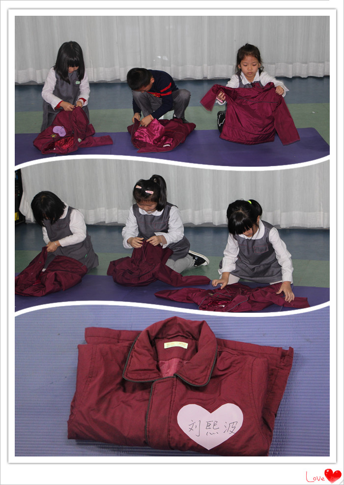 ●大班:穿脫衣服(冬天棉服外套,扣紐扣拉拉鏈并脫下來整理)