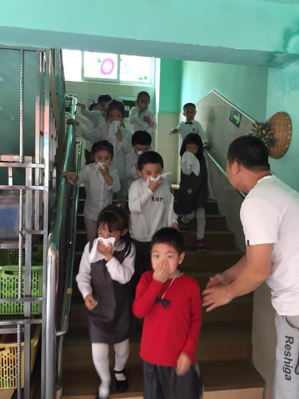 上午11:00分,幼兒園響起了緊急的警報聲,拉開了本學(xué)期的消防逃生演練活動,全體孩子們在老師及消防員的引領(lǐng)下,用毛巾捂住口鼻,俯身迅速撤離教室,沿安全路線有序聚集到操場后各班向園長媽媽匯報疏散情況。從火警響起到撤離安全區(qū)域僅用時2分鐘,整個演練過程快速、安全、有序。演練現(xiàn)場,大班的哥哥姐姐還向大家展示了如何逃生自救。