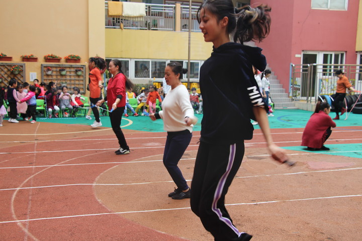 接下來是跳繩比賽,看老師們一個個身輕如燕,那揮舞著的跳繩的樣子格外認真。