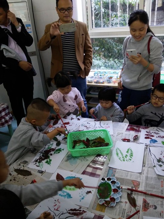看!我們在用樹葉印畫,爸爸媽媽看的比我們還認真!
