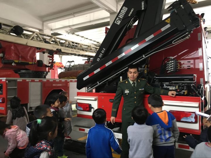 接著帶我們參觀各種消防車,有排煙消防車、搶險救援車、云梯消防車、泡沫水灌車,并詳細(xì)地給孩子們講解了每輛車的名稱、功能、操作事項及車內(nèi)各類救援器材和在滅火救援任務(wù)中的用途。