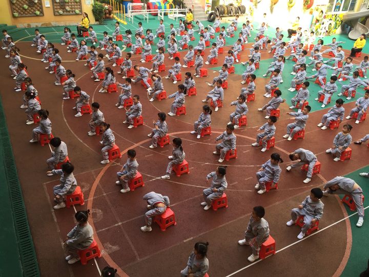 接著中班組的小朋友亮相啦!在老師的帶領下,他們拿著紅色的小椅子,排著整齊的隊伍,踏著有力的步伐出場了,動作整齊到位,隊形變化有致,孩子們在歡快的音樂聲中,成功展示了健康活潑、積極向上的風采。