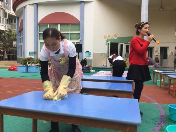 此次比賽分為兩個部分,一為知識問答環(huán)節(jié),在此環(huán)節(jié)要求保育教師在規(guī)定時間能準確無誤地回答出所抽取的理論知識題目。二為實操環(huán)節(jié),其中實操環(huán)節(jié)由消毒桌面與整理床鋪兩部分組成。 在這環(huán)節(jié)都要求保育教師在規(guī)定的時間內(nèi),能夠動作規(guī)范、熟練快速地完成。