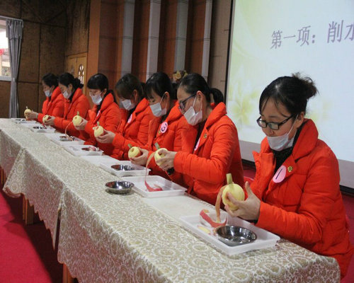 時間: 2017-12-29 作者:yuanhengjia 閱讀次數: 26662017年12月27日上午9:30分,長壽區遠恒佳實驗幼兒園、遠恒佳陽光園、遠恒佳菩提印象園全體保育老師在遠恒佳教育集團學前教育中心長壽分部的組織下進行了削水果、疊被子兩項技能競賽。