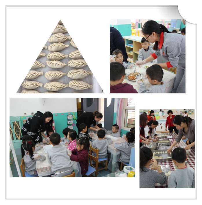 孩子們在老師和家長的帶領下包餃子。