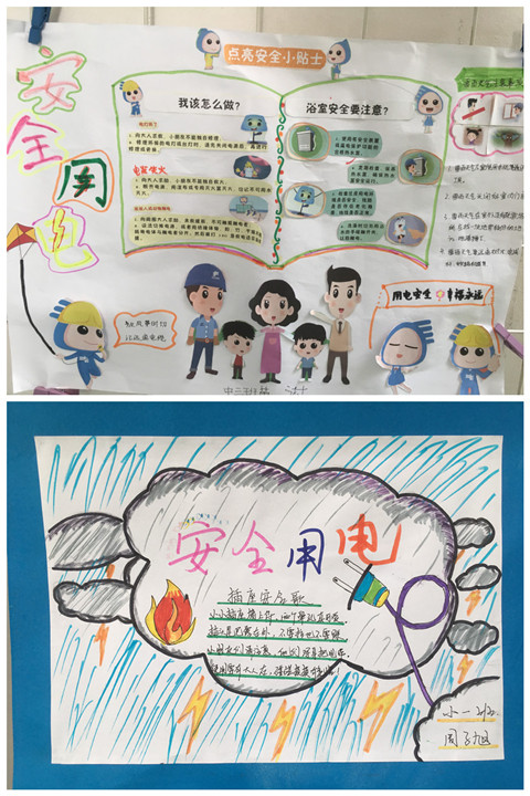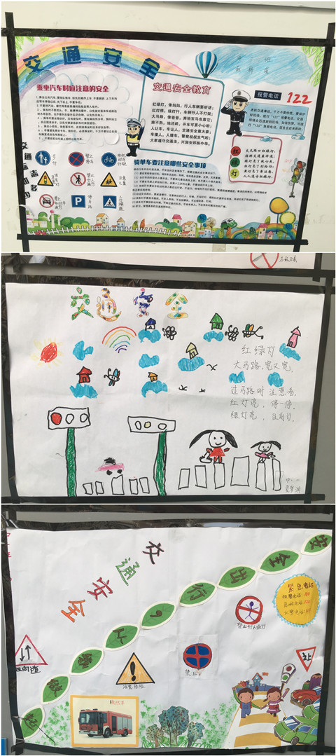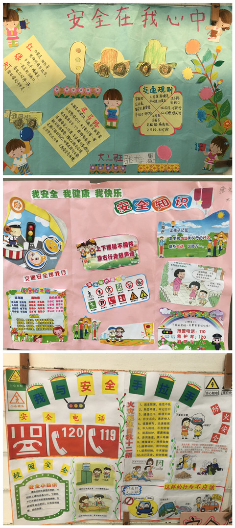 為了將枯燥的安全知識生動的展現在孩子面前,我園在走廊制作了兩塊《安全兒歌》板,張貼朗朗上口的安全兒歌、安全標志、并配合卡通圖案,吸引幼兒認識常見的安全標志,孩子們在走廊散步的時候可以習得有關安全方面的知識。通過向家長發放致家長一封信和親子制作以食品安全、交通安全、消防安全、居家安全、自然災害安全為主題親子剪貼報宣傳校園安全知識,增強幼兒和家長的安全意識,提高自護自救能力。