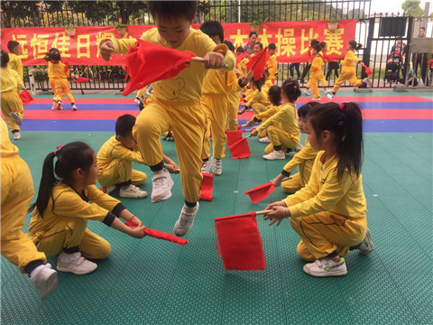 大班組第一學期幼兒體能操是藝術操,幼兒通過力量、速度、耐力、協調、柔韌、靈敏等運動能力的練習,他們的體能有著較大的進步。而且,還保持著良好的狀態。在這學期大班幼兒體能操為器械操——旗操,根據體能操指引的要求,并結合器械特點:紅色四方旗,我們在選擇音樂上采用了具有中國范的音樂,歌曲,氣勢磅礴,音樂起旗翻動!