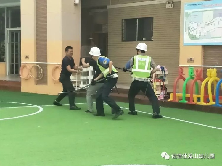 同時,幼兒園應(yīng)急小組緊急行動,按防暴應(yīng)急預(yù)案要求手持棍棒、鋼叉等,將“歹徒”圍住,與“歹徒”交涉、周旋,設(shè)法牽制“歹徒”,竭力保護(hù)幼兒安全。