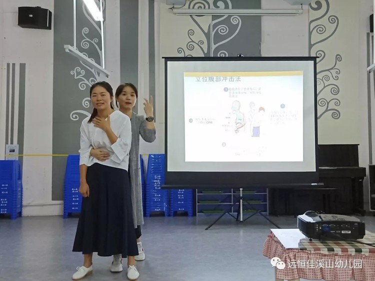 涂醫生運用PPT詳細直觀地為幼兒園教職工講解了如何在幼兒園進行常見病識別、預防和處理。指導教師正確處理幼兒擦傷、燒傷、燙傷、止血包扎、觸電、發熱、高熱驚厥、骨折、氣管異物的方法。什么情況下應該打120急救,什么情況下應該告知家長。并現場對老師進行海姆立克急救法培訓,通過模擬示范、動作演練,讓老師掌握萬一幼兒在園發生氣管異物,如何立刻采取有效急救措施,防止意外發生。