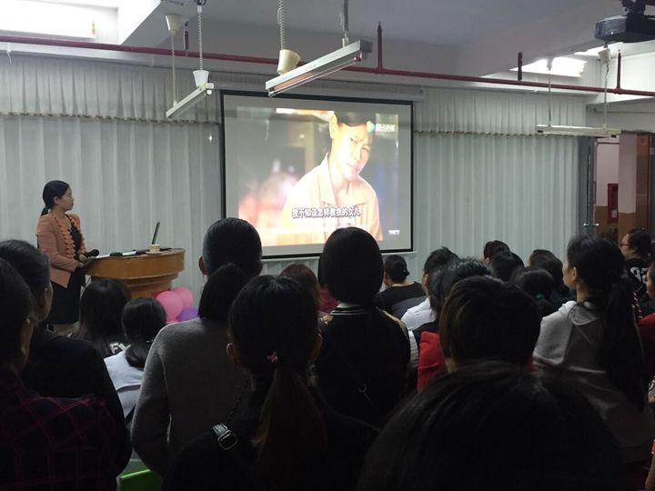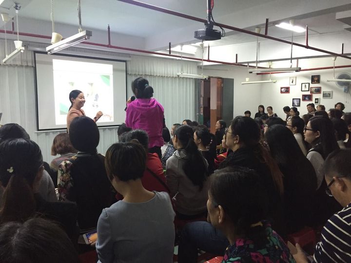 王園長從“玩中學、做中學、和生活中學”這三個方面展開了此次講座。首先,王園長向家長們闡述了《3—6歲兒童學習與發展指南》中所提到的“幼兒的學習是以直接經驗為基礎,在游戲和日常生活中進行的”,以此來打消了家長認為孩子在幼兒園只會玩的疑慮。緊接著,王園長又通過大量的圖片和視頻進一步向家長解釋了孩子們在幼兒園的每一個環節中可以學到些什么。在這期間,王園長還特意提出了“孩子耍賴和學習的關聯”,并且詳細地指導家長面對孩子耍賴時的處理方法。最后,王園長向家長推薦故事繪本《彩虹的盡頭》,再次提出“不要用成人的標準,用一把尺子統一丈量所有的孩子”。
