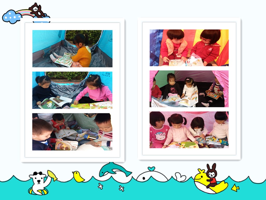 在活動接近尾聲時,我們可愛的小班級組的小朋友們迎來了他們有趣的帳篷換書讀書會。小朋友們帶著自己的好同學、好伙伴,三五成群地進入帳篷中,安靜、認真地閱讀著別的小朋友帶來的有趣的書籍,共同體驗著好書共讀的趣味與美妙。