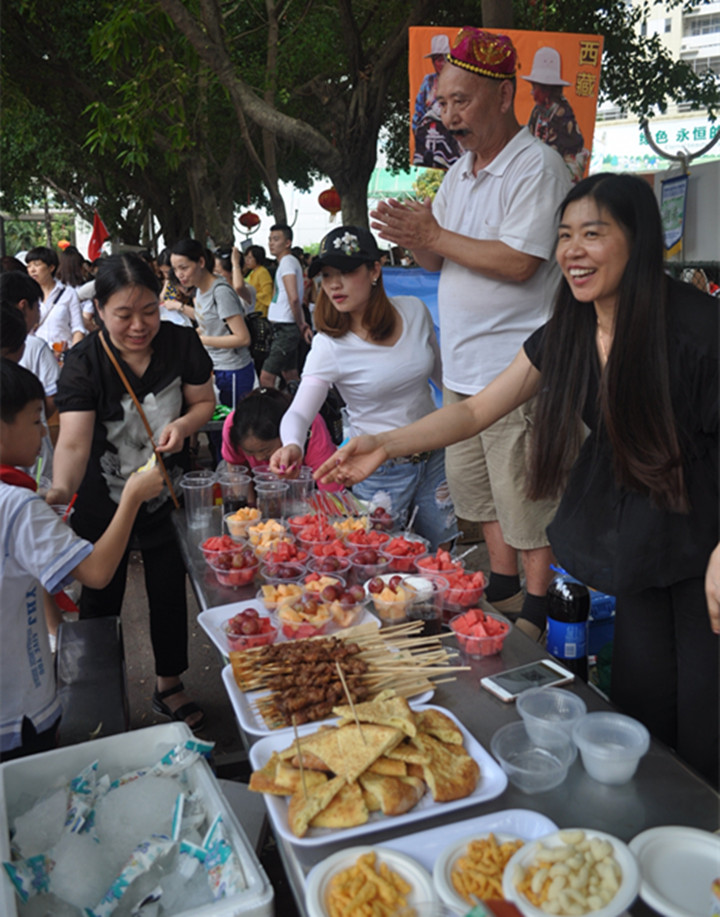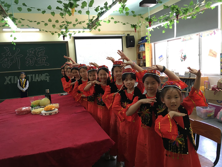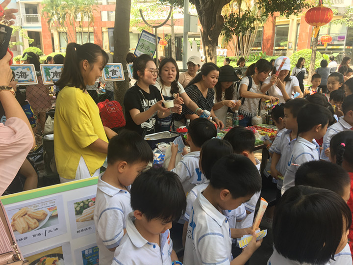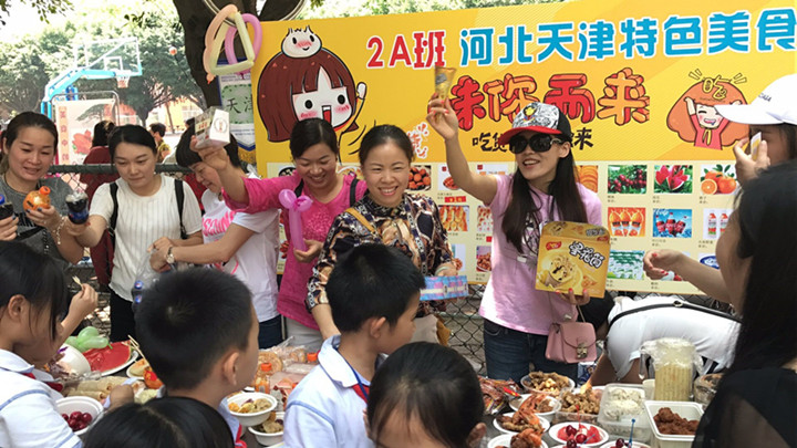 瞧!一年級小朋友攤位準備的是華南華中地區的特色美食:武漢熱干面、廣東各類粵菜,廣西梧州龜苓膏,江西清明果蒙古,湖南臭豆腐,河南大餅,還要澳門各類特色糕點小吃。二年級攤位的是華北東北地區的美食:老北京冰棍、蒙古烤全羊、奶制品等。三年級江浙地區的特色美食有:東坡肉、荷葉粉、黃山石雞等。四年級西北地區的涼皮、烤羊肉串、葡萄干等。五年級西南地區的云南米線、四川泡菜等。六年級香港臺灣地區各種點心……