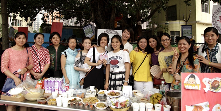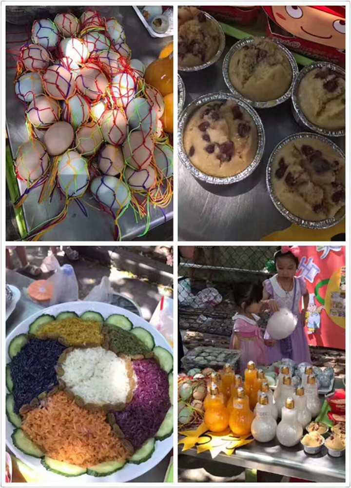 活動之初,每個班就已經根據自己班級的特色,設計好了菜譜,等到今天烹飪好帶過來。中午1點鐘左右,各班家長義工帶著孩子們,紛紛端著自己精心制作,并代表班級“省份”的美食來到義賣區域。每個班級有固定的一個攤位,攤位后上方有寫著代表各自地方區域的旗幟,左右兩邊是各班自由設計的美食介紹、廣告語和圖片。孩子們、家長們先把食物分門別類,精心包裝好,又定好價錢,整理好自己的攤位,爭取以最好的面貌來迎接前來購買的小顧客們。