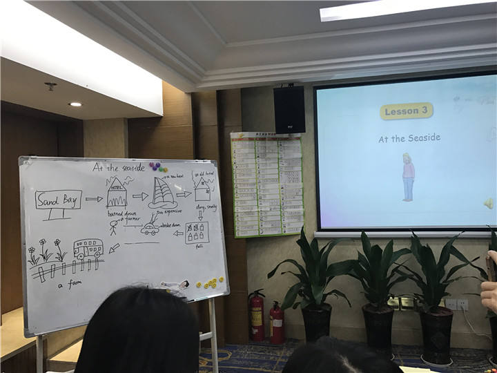 第二天上午的主題是自然拼音教學,是由講師為我們講解自然拼讀教學的意義、目標、核心原則與方法,同時還展示了課堂實操,讓我們更直觀地理解了自然拼讀法的意義和具體操作方式。在學習了上午的理論知識后,下午我們所有學員分組進行故事教學設計與展示,我們被分到了第五組,我們與同組的老師們在很短的時間內完成了At the Seaside教學設計和講故事的設計,其中我們的亮點是簡筆畫教學和分層教學,給現場的老師們留下了深刻的印象。