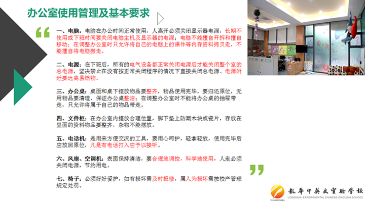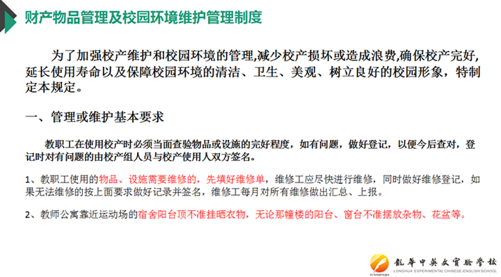 最后是對“學校安全、財產、節能等注意事項”進行解讀,在此環節,對環境衛生、節水節能、物品保管、功能室及教學設備用具使用、安全管理安全教育及安全防護、物品借領及發放、校園車輛停放等工作、生活、安全方面的注意事項進行了較簡要的說明,同時明確了老師們身上的工作責任。