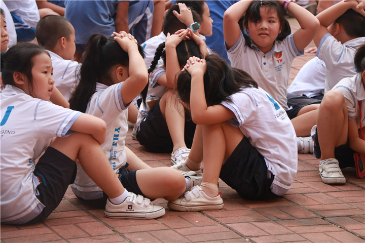 第一階段,演練過程中,當(dāng)學(xué)生們聽到“地震發(fā)生”的信號,老師組織學(xué)生進(jìn)行避震,反映迅速,動作標(biāo)準(zhǔn)。