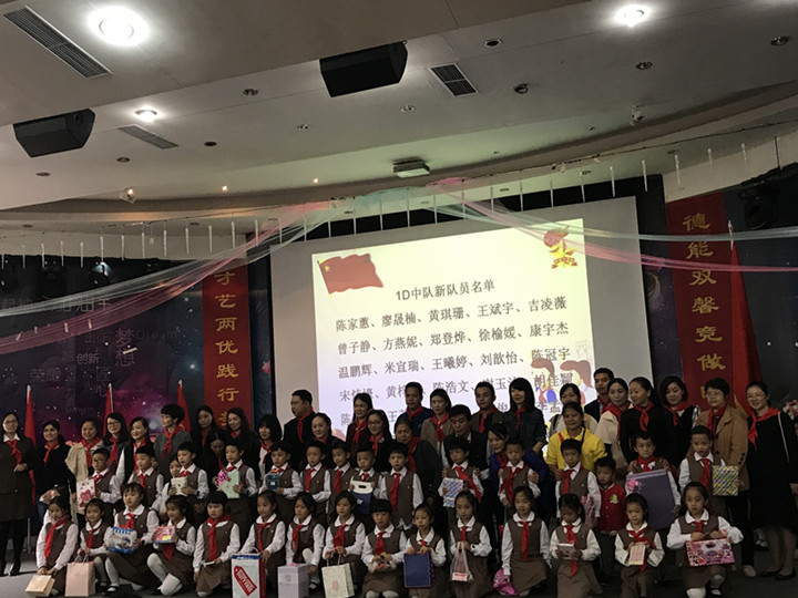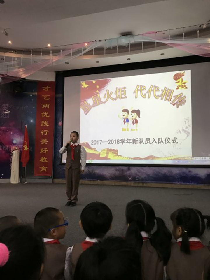 儀式上,少先隊(duì)六年級(jí)的大哥哥、大姐姐為新入隊(duì)的弟弟、妹妹們佩戴了紅領(lǐng)巾,臺(tái)下的家長(zhǎng)拿出事先準(zhǔn)備好的禮物走上臺(tái)去送給新隊(duì)員對(duì)他們的入隊(duì)表示祝賀。新老隊(duì)員在鮮艷的隊(duì)旗下莊嚴(yán)宣誓。1F中隊(duì)的黃煜林同學(xué)作為新隊(duì)員代表發(fā)言,表達(dá)了入隊(duì)后的喜悅心情,也表示以后要用實(shí)際行動(dòng)為紅領(lǐng)巾增光添彩,爭(zhēng)做一名優(yōu)秀的少先隊(duì)員!