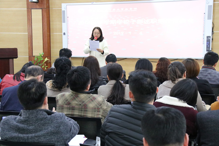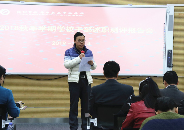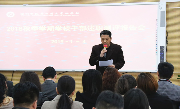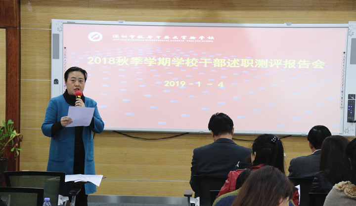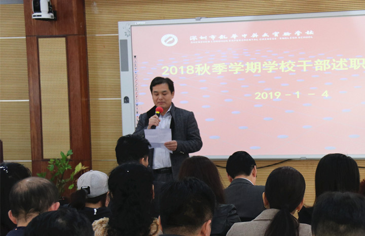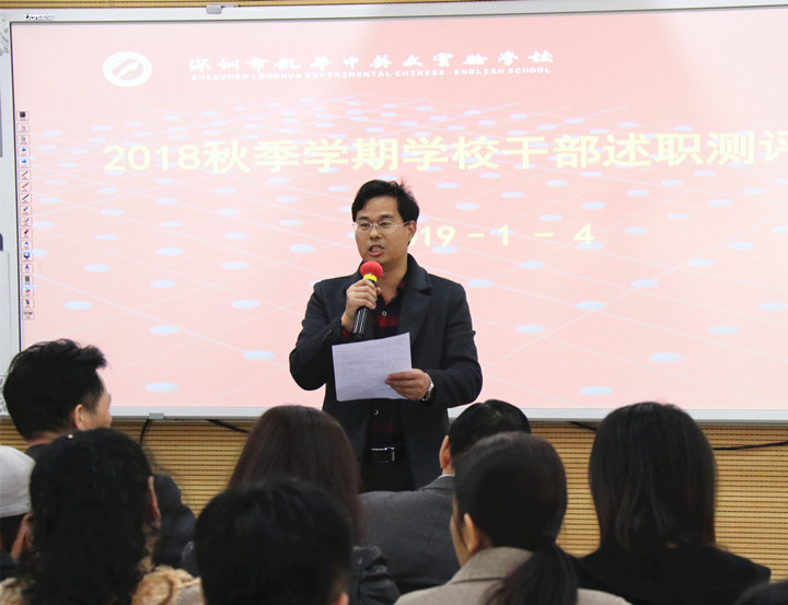 時間: 2019-01-11 作者:龍華中英文實驗學校 閱讀次數(shù): 30942019年01月04日下午,我校“2018秋季學期干部述職測評報告會”在教師培訓中心召開,學校14名干部在會上進行了學期工作總結(jié),來自小學、初中、高中、藝體信息四個部門的50名年級主任、學科主任、班主任及家長代表聽取了報告會,并進行了現(xiàn)場民主測評。總結(jié)報告會及測評工作由學校金玉善副校長主持,全國名校長、特級教師、學校卜祥林校長,學校胡化忠副校長,以及集團戴桓標副總裁參加了報告會。