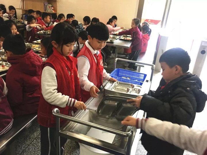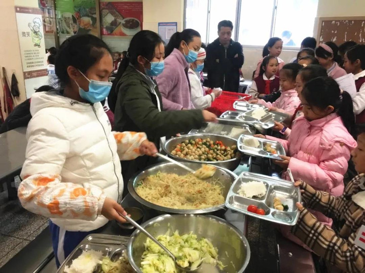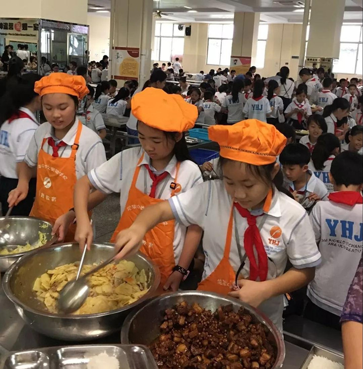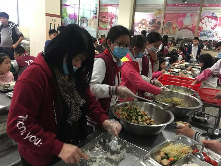 為同學們分菜:你一勺,我一勺,分工合作很到位