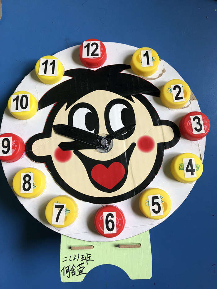 二年級:創意鐘表制作,充分發揮想象力和創造力,通過“變廢為寶”的方式,將自己心中的鐘面描繪在塑料瓶上、硬紙盒上、卡紙上。孩子的創新思維讓人驚嘆,甚至有孩子用羅馬數字制作了別樣的鐘面。