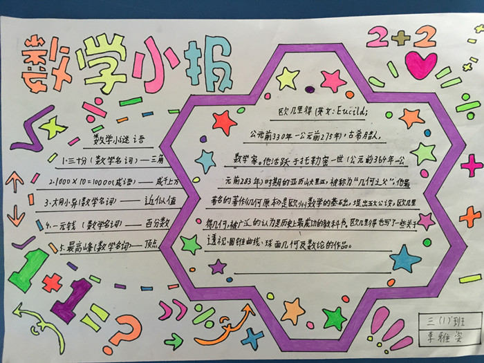 三年級:數學手抄報,通過了一張張精美的手抄報制作,讓我們走進了數學家的故事,領略了數學名人的風采,讓我們見識了數學名題、數學趣題,開拓了數學思維,讓我們了解了數學日記,打開了數學知識的大門。