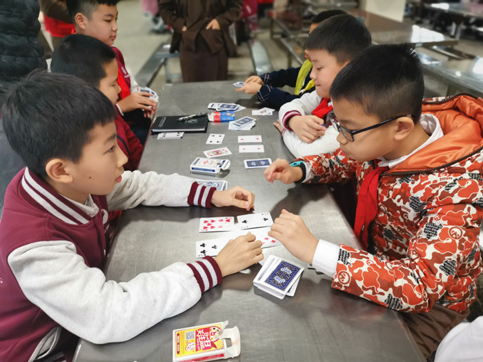 三年級、五年級:“24點挑戰賽”,用小小的撲克牌,凸顯著我們的速算能力。認真思考的我們!