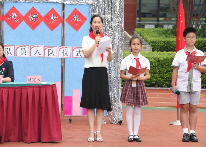 少先隊(duì)大隊(duì)輔導(dǎo)員馬定云老師在儀式中發(fā)表了講話。她在向新隊(duì)員表示祝賀的同時(shí),激勵(lì)新老隊(duì)員用實(shí)際行動(dòng)“踐行核心價(jià)值觀,爭(zhēng)做時(shí)代好隊(duì)員”。整齊響亮的“時(shí)刻準(zhǔn)備著”的呼號(hào)表達(dá)了隊(duì)員們?yōu)榧t領(lǐng)巾增添光彩的決心、信心和恒心。