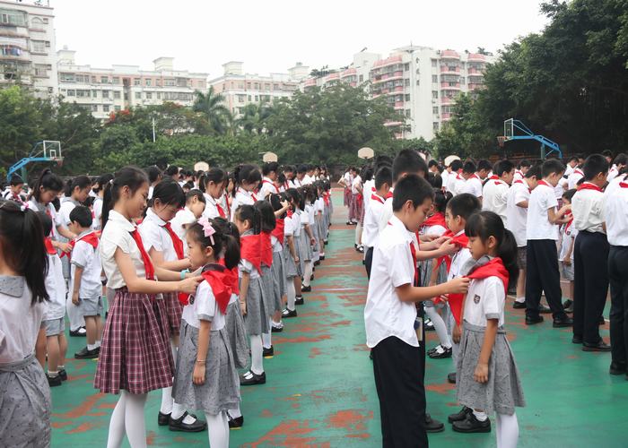 老隊(duì)員為新隊(duì)員佩戴紅領(lǐng)巾