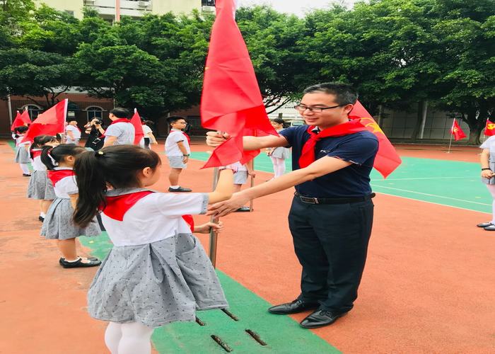 大隊(duì)輔導(dǎo)員馬定云老師為新建中隊(duì)授中隊(duì)旗