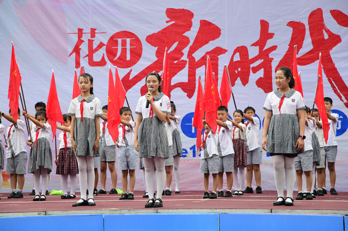 第三篇章,著力展現孩子們的進步和收獲。篇章節目涵蓋舞蹈、英語劇、科創、美術、經典歌曲傳唱等多種藝術形式。舞蹈《小白翎》精湛的表演讓觀眾目不暇接;《科創未來》融創客、美術、手工為一體,充分展現了孩子的動手能力和科創水平。最值得稱贊的是,當節目進行到尾聲時,天空竟下起了雨,表演《我們是共產主義接班人》的大隊委、中隊委們,在臺上面向隊旗、莊嚴宣誓、揮舞隊旗、齊唱隊歌,臺上臺下相呼應,風雨之中見精神,受到來賓和家長的高度贊揚。