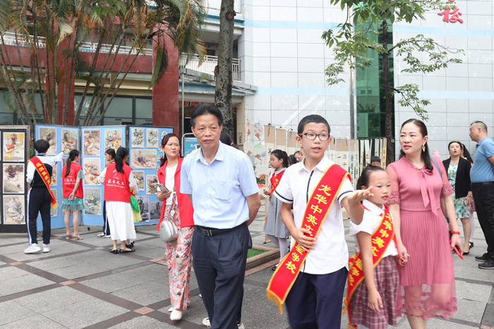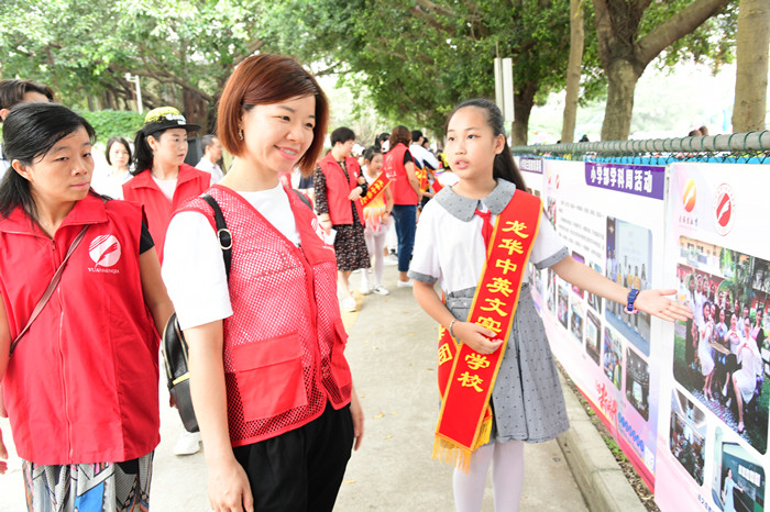 訓練有素的近60名一至六年級的小主持人,一對一拉著嘉賓和家長的手,參觀豐富多彩的學科作品,欣賞精巧精美的手工作品,品味富有特色的書法和布藝作品。小解說員良好的儀態、自信的解說、燦爛的笑臉成了作品展區一道靚麗的風景,來賓與家長贊嘆不已。