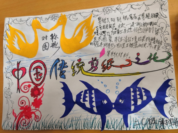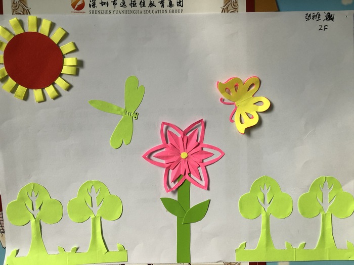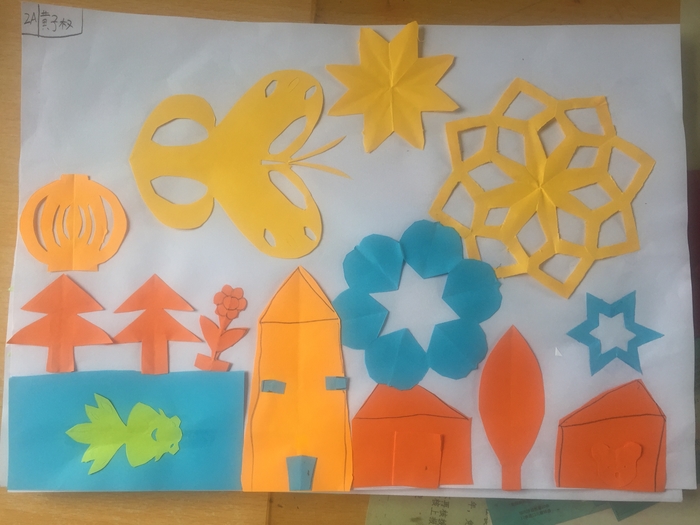運(yùn)用數(shù)學(xué)課上學(xué)習(xí)的“對稱圖形原理”剪出各種圖案,并創(chuàng)意粘貼成畫,既鼓勵孩子們充分發(fā)揮想象力和創(chuàng)造力,又滲透傳承中國傳統(tǒng)剪紙文化,一舉多得。