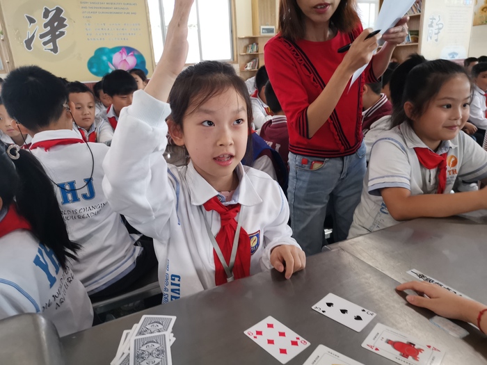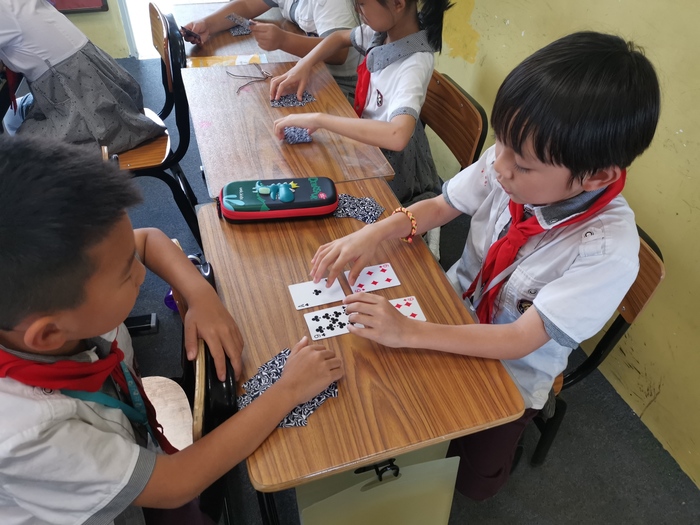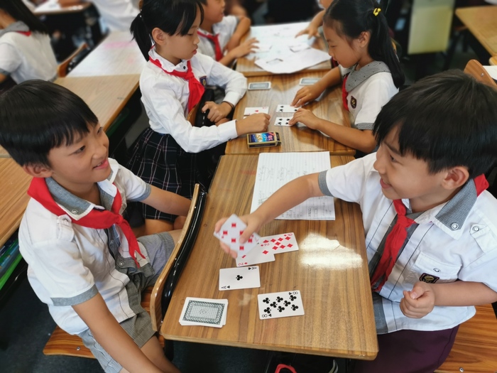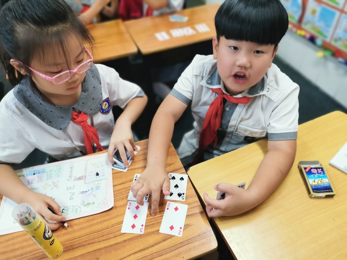 剛剛開啟兩個月學(xué)習(xí)生活的小一學(xué)生,使用“數(shù)學(xué)排序”思維做游戲,以最快的速度翻出1-9的數(shù)字紙牌。孩子們眼神專注,興趣盎然。