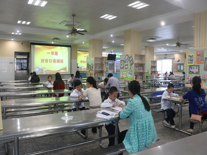 活動中,陳志鋒校長全場進行指導和部署,學生由一年級的副班主任帶領到候考區,趙立梅老師和王小倩老師組織學生進入檢測地點。這時,語文組的老師做好準備,嚴格按照活動方案,對學生進行拼音檢測。