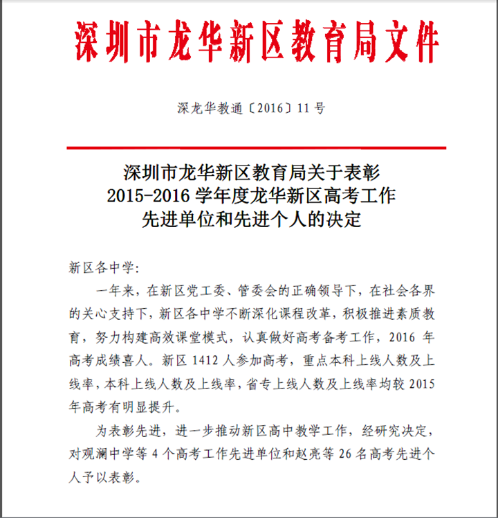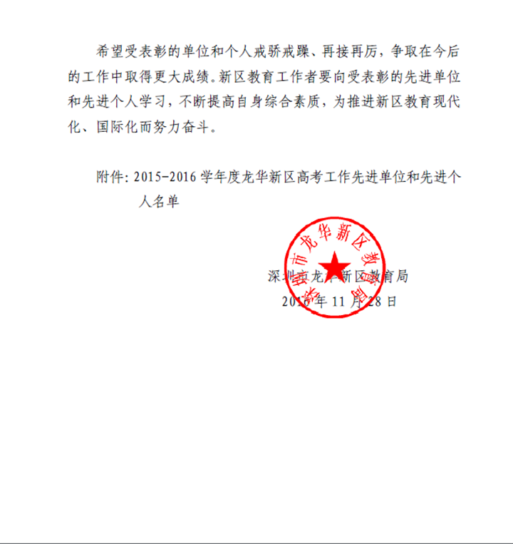 2016年12月02日上午,龍華新區教育局召開龍華新區2016年中、高考工作總結大會,深圳市龍華中英文實驗學校獲得了“龍華新區2016年高考先進單位”榮譽稱號。
