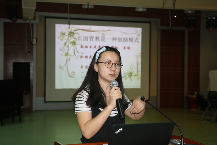 二年級的郭蘇陳老師說:“我每天都用微笑來迎接孩子們,給他們設置一個個美麗的‘圈套’,來引導他們快樂、健康地成長”!周琴老師則認為正面教育給大家帶來的是一劑心靈雞湯,讓老師們意識到特殊孩子的特殊行為是孩子成長的需要,要和善而堅定地去鼓勵,才能有更好的效果。五年級的楊柳靜老師為她放手給孩子去管理班級找到了理論依據,學生的責任感和自律意識在實踐中更能得到提高;徐敏紅老師結合學校實施的成長銀行D幣富翁評比操作總結道:“只要多一點尊重、充分相信孩子們的能力,換位思考;孩子們會回報給你一個驚喜”!四位老師的分享與教育教學實踐緊密結合,引發更多老師的思考,報告廳里,不時傳來陣陣掌聲。