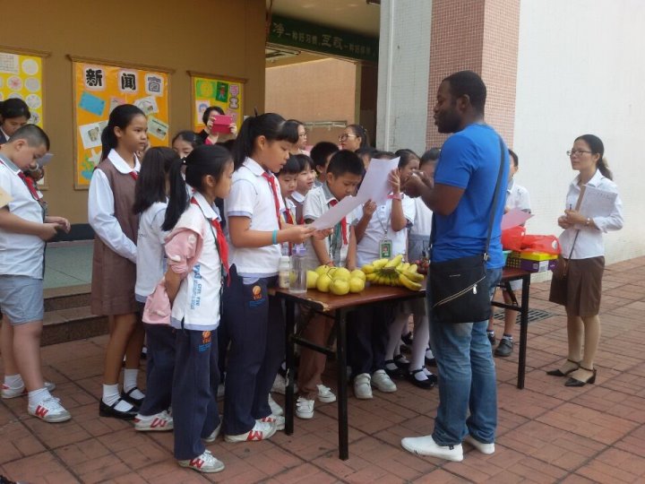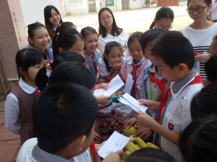 2016年10月10日上午,外教Antony在教學樓廣場上布置水果攤位,組織五A班學生買賣水果,讓孩子們在生活情景中運用英語口語。前來觀摩的老師們興致勃勃地融入到孩子們的活動中,主動與孩子們用英文對話。雖然孩子們全英語交流有些吃力,但他們還是非常努力地用英文完成了水果的售賣與購買的交際活動,整個過程開心無比。(文、圖/莫三愛)