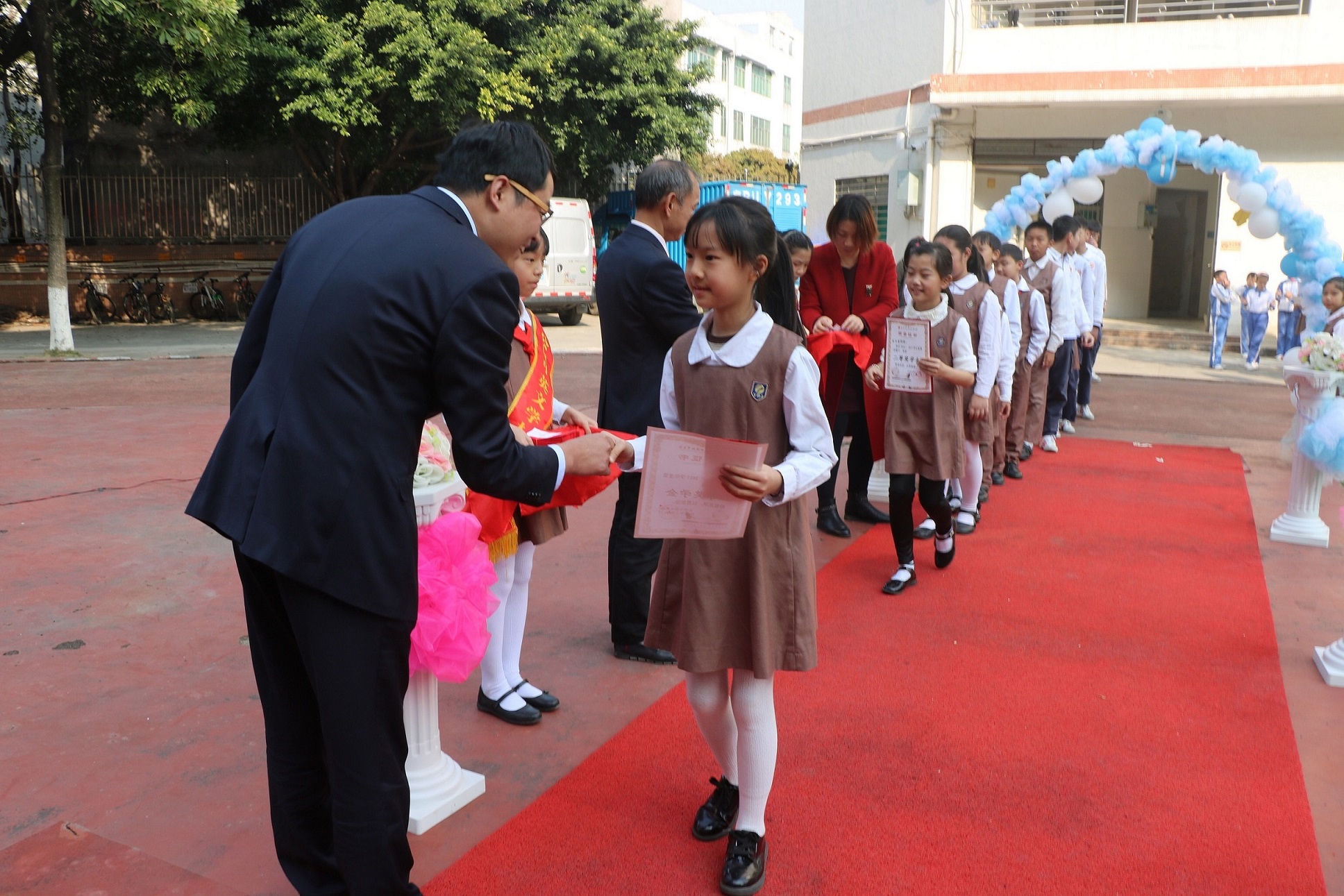 當(dāng)天上午,在公明中英文學(xué)校的開學(xué)典禮上,235名上學(xué)期表現(xiàn)優(yōu)秀的學(xué)生走上紅地毯,一一與該校校長握手,領(lǐng)取獎(jiǎng)狀、獎(jiǎng)金,拍照留念,著實(shí)過了一把明星癮。據(jù)悉,為給孩子們帶來新學(xué)期的驚喜,該校在做好第一次晨練、上好第一堂課、接好第一趟校車等常規(guī)工作的同時(shí),精心策劃了這次開學(xué)典禮,上學(xué)期獲評優(yōu)才獎(jiǎng)的學(xué)生走上紅地毯,得到新春祝福與發(fā)放的獎(jiǎng)學(xué)金。優(yōu)才獎(jiǎng)每學(xué)期評選一次,主要從學(xué)生的行為習(xí)慣、特長發(fā)展和學(xué)科成績等方面綜合考評。