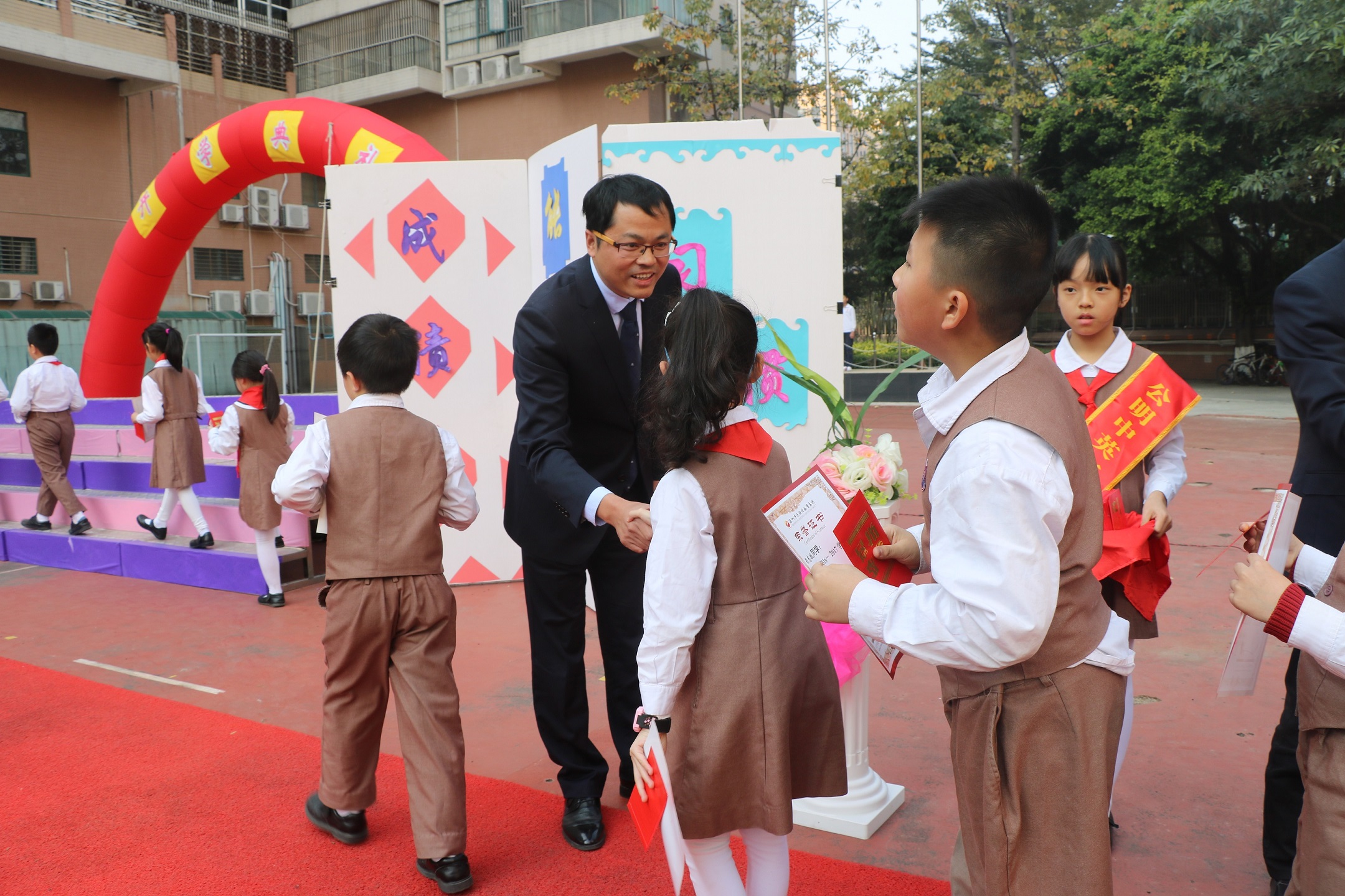 公明中英文學(xué)校學(xué)生走上紅地毯,與校長握手。