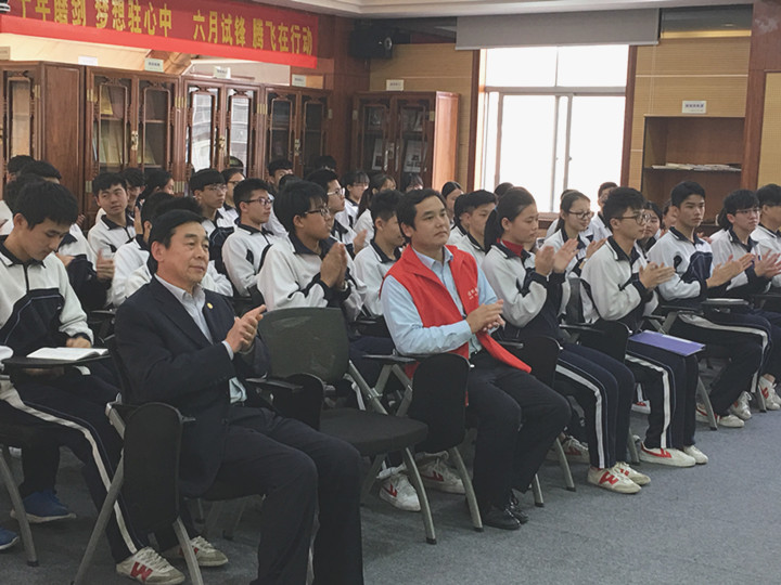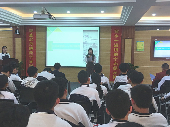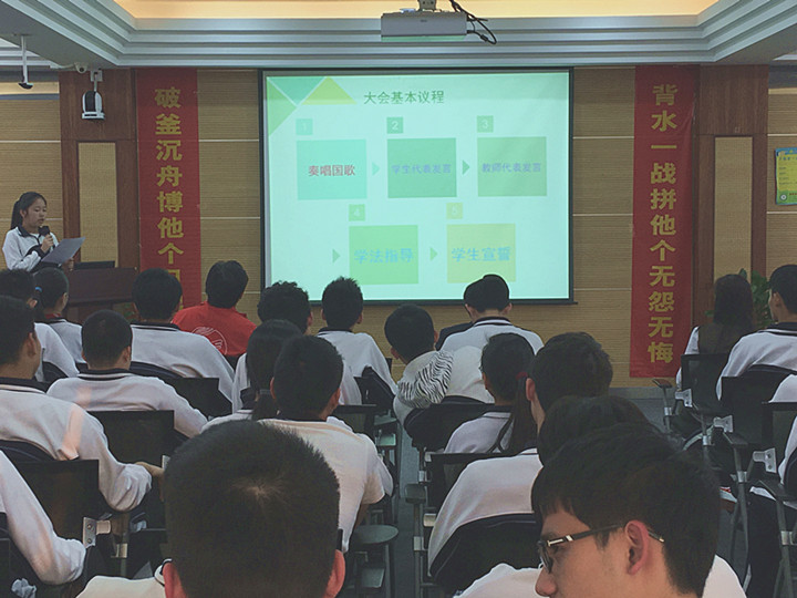 下午5時許,學生會主持人梁佳婷同學宣布會議開始。大會在嘹亮的國歌聲中拉開序幕,全體師生起立,奏唱國歌。首先,高三(2)班的賈理同學代表全體高三學生發言。他說:“少年自有少年狂,藐昆侖,笑呂梁,磨劍十年,今將試鋒芒!如果說之前的十二年是漫長的馬拉松,那么現在,我們已進入那最后的沖刺階段。讓我們不負父母的期盼,不負恩師的囑托,不負學校的厚望,頑強拼搏,全力以赴,鑄就輝煌!”