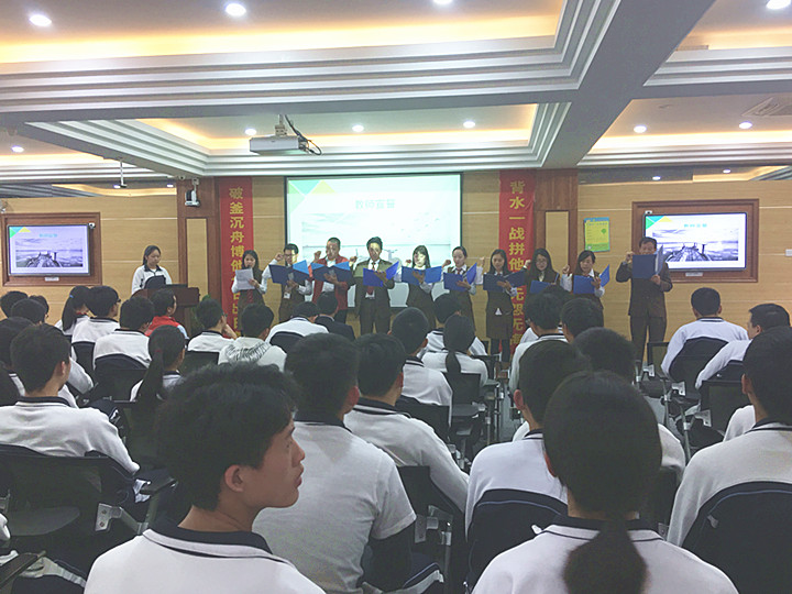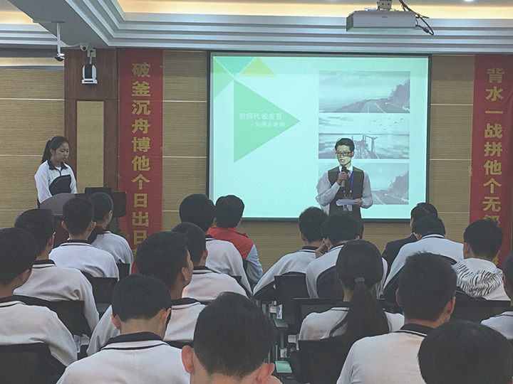 接下來教師代表劉德志老師發言:“最后一百天,為了每位學生的理想,我們2017屆全體高三教師將:忠于職守,以身作則;樂于奉獻,刻苦鉆研;穩扎穩打,科學備考;嚴實精細,精益求精;精誠團結,榮辱與共!”