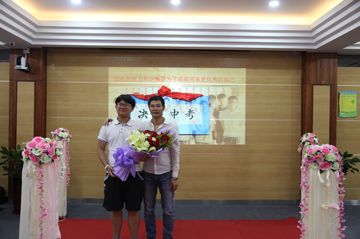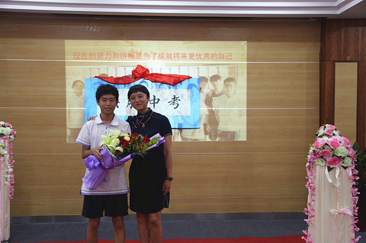 會議由李劍鋒主任主持,首先是由卜校長、張主任、初三的兩位班主任、初三優秀學生代表及其家長等人鄭重地完成了“決勝中考”的揭牌儀式,擂響了中考最后沖刺50天的戰鼓。接著,在所有同學、老師的熱烈掌聲中,上周在龍華區二模考試中取得了優異成績的13名學生在家長的陪同下一同走上了象征光榮和驕傲的紅地毯,并手捧鮮花合影留念,成為了在場所有同學的學習榜樣。