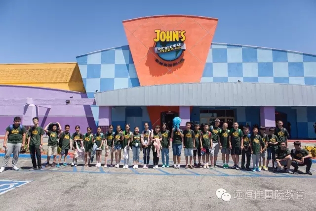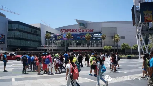 隨后,同學們來到了著名的斯臺普斯球館,這里,是著名的NBA球隊洛杉磯湖人以及洛杉磯快船隊的主場,男生們迫不及待地在雕塑面前,與NBA名宿魔術師約翰遜,天溝賈巴爾等的雕像合影。