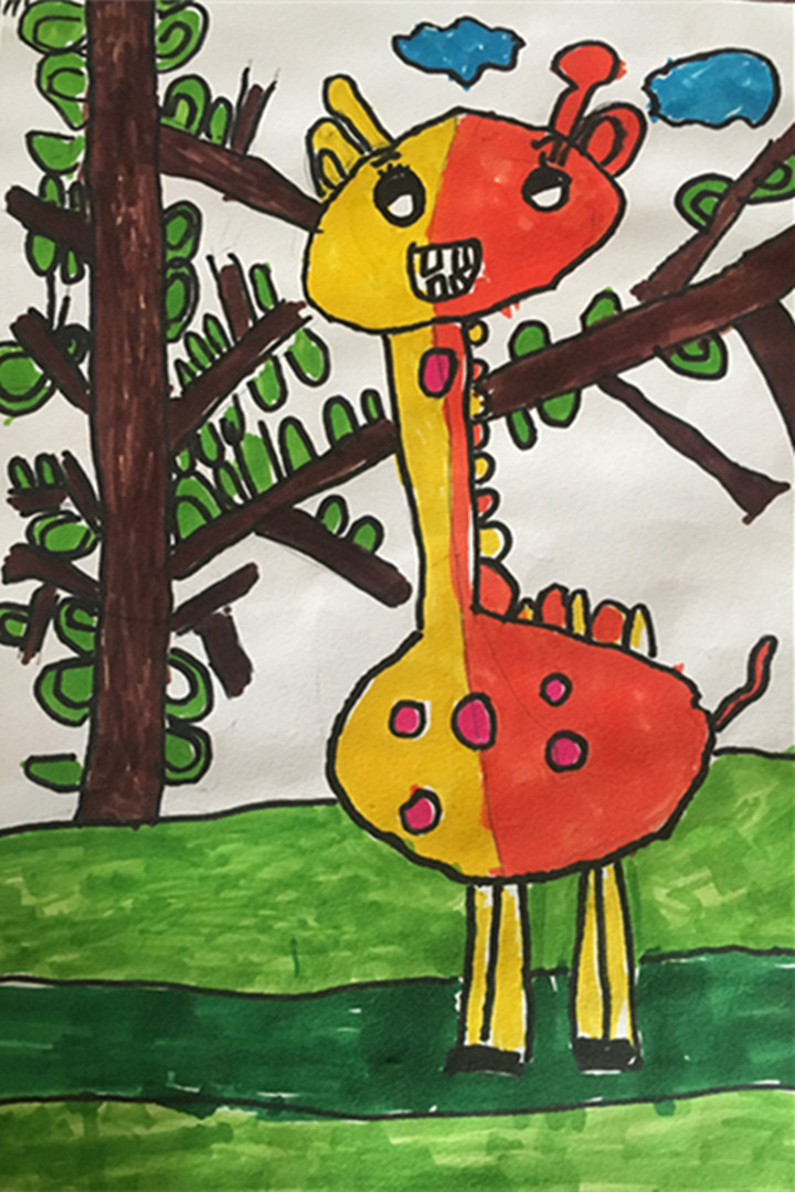 圖五是來自創(chuàng)意美術(shù)C班杜俊豪的作品《快樂的長頸鹿》,讓我們感受到了小朋友內(nèi)心對動物的喜愛。