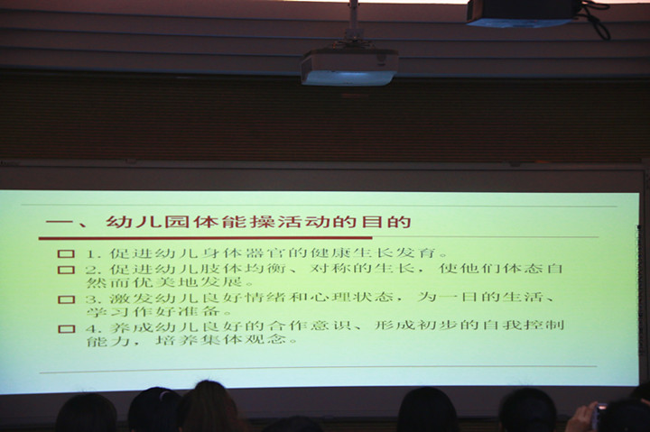 韓進老師在幼兒園采集最原汁原味的幼兒早操活動給學員觀看。幼兒園體能操編排的基本要求有四個部分:熱身(隊列)活動——基本操節——體能鍛煉——整理活動。在編排體操上選用器材與不使用器材的區別,選用器材是否符合主題,貼近孩子生活。