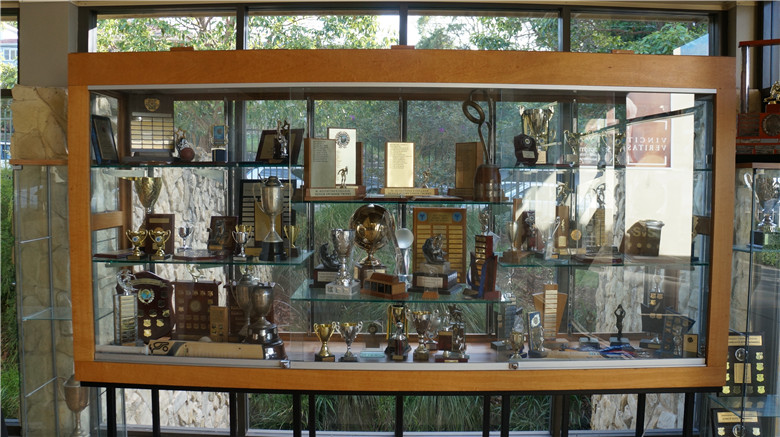 (圣奧古斯丁)接待大廳陳列的徽章、獎牌以及歷屆的名人